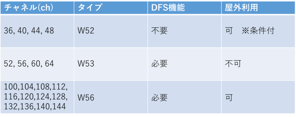 W53, W56を使用できるよう、DFS機能への対応方法を調査したい